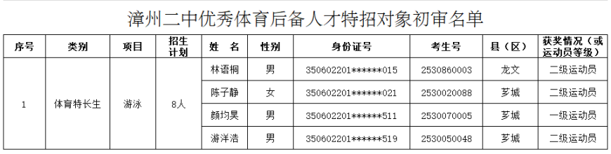 漳州二中(77779193永利集团)2025年体育特长生及优秀体育后备人才特招对象资格认定情况公示