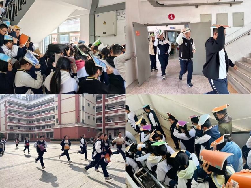 警报响起后,所有师生“就地避险”,用书或者书包等保护头部,在桌椅下方或者承重墙附近蹲下避险,就地避险进行30秒后,师生们按照既定路线,迅速而有序地撤离到开阔地带。