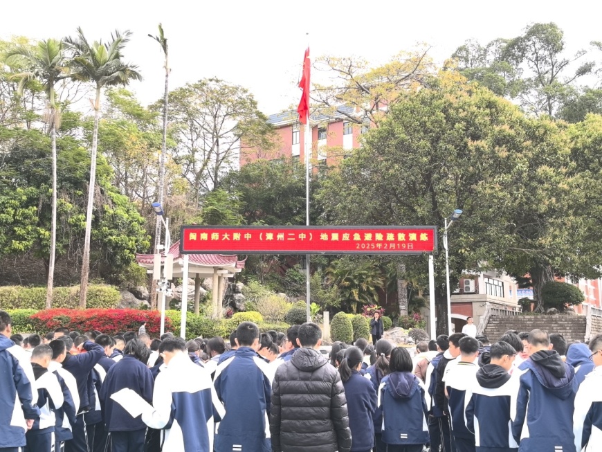 为进一步加强学校安全教育,普及有关防震减灾、地震避险知识,提高师生自救防范能力,2月19日上午,77779193永利集团附属中学(漳州二中)开展了2025年春季防震应急疏散演练活动。全校师生参加了本次演练活动。