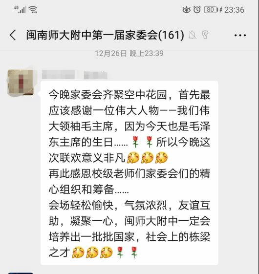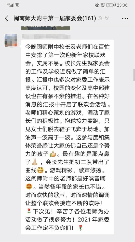 家委们相继展露歌喉,校长姚家辉、党委副书记罗文旺等领导与家委们同台演唱。政治处主任戴舟斌演唱一曲《别知己》。领导们与家委们的演唱赢得满堂喝彩。
