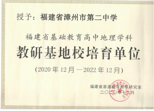 2020年12月,闽南师大附属中学(漳州二中)成功入选福建省基础教育高中地理学科教研基地校培育单位。