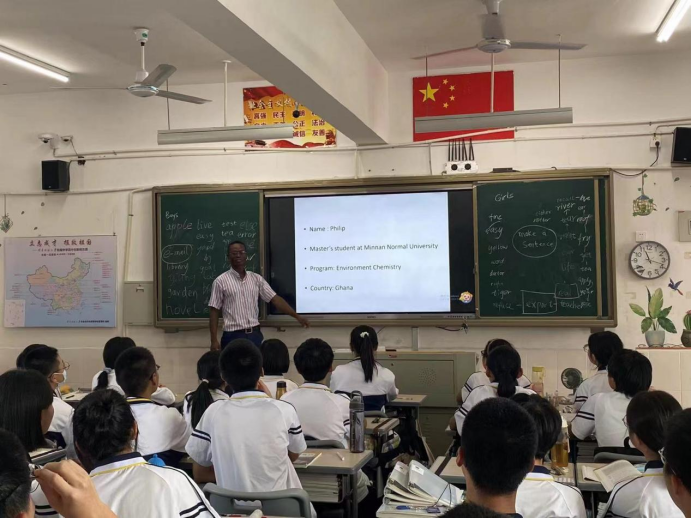 为了提高同学们学习英语的兴趣,闽师大附中邀请外教进课堂,每周定期授课,掀起学习英语的热潮。