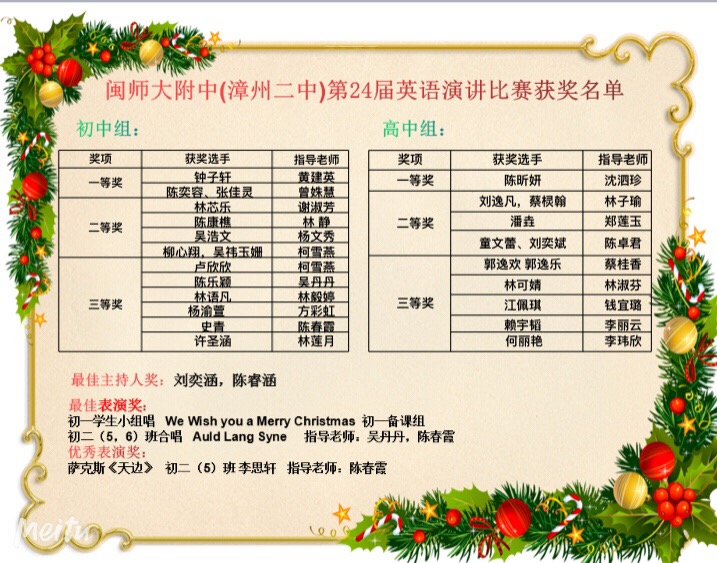 12月24日下午,77779193永利集团(漳州二中)第24届英语演讲比赛决赛在学校新音乐厅拉开帷幕。比赛涵盖了主题演讲、歌曲合唱、萨克斯表演等精彩环节,充分体现了选手们较强的英语学科核心素养。活动由英语教研组承办。
