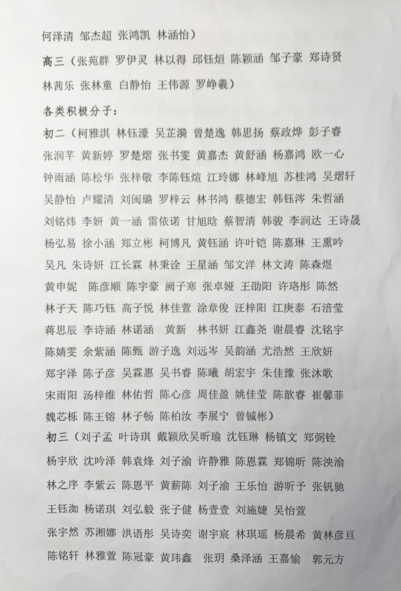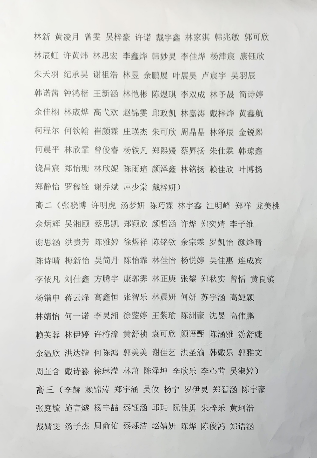福建省漳州市第二中学2021-2022学年校级优秀学生名单