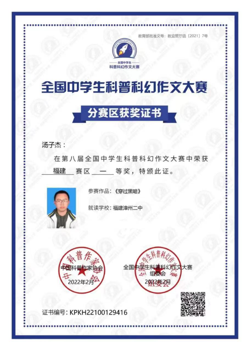 日前,第八届全国中学生科普科幻作文大赛传来喜报!我校高二(2)班汤子杰同学在第八届全国中学生科普科幻作文大赛中荣获全国三等奖,福建赛区一等奖的好成绩!